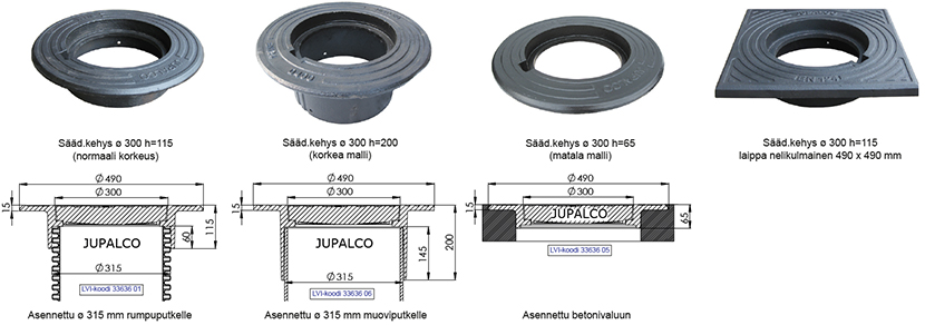 Sääd.kehys ø 300 kehys matala h=65 mm | 3363605 | 109,00 | Matalassa mallissa ei kiinnitysreikiä, mutta esim. raudoitusta varten voidaan tehdä tartuntareiät työmaalla. |