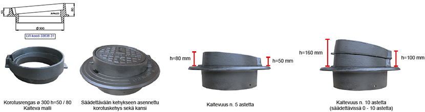Korotusrengas ø 300 h=50 / 80 mm | 3363631 | 90,00 | Kalteva malli. Korotus 50 / 80 mm Korotusrenkaita voidaan asentaa useampi päällekkäin. |