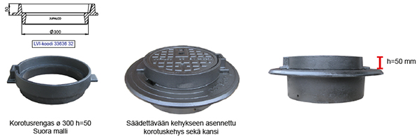 Korotusrengas ø 300 h=50 mm | 3363632 | 79,00 | Suora malli. Korotus 50 mm Korotusrenkaita voidaan asentaa useampi päällekkäin. |