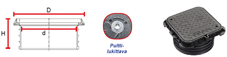 Kehys ja kansi myydään aina settinä. Painoluokitukset ovat A15 - E600. Osa kansistoista on varustettu lukituksella. Kannen avaamiseen ja lukitukseen tarvitaan tällöin siihen sopiva työkalu. Osaan malleista sisältyy myös tiiviste.