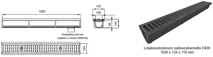 Linjakuivatuskouru VR100P Sadevesikannella D400 Poistoyhde 85 mm | 1000 x 124 x 110 | D400 (40tn) | 3366604 | 136,00 |
