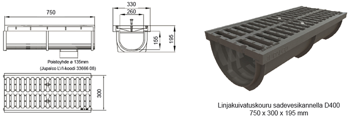 Linjakuivatuskouru VR300P Sadevesikannella D400 Poistoyhde 135 mm | 750 x 300 x 195 | D400 (40tn) | 3366608 | 334,00 |