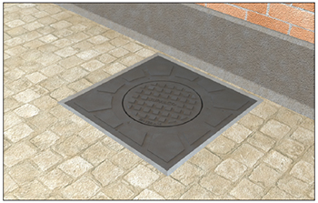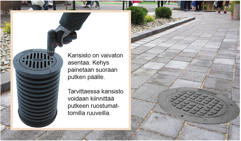 Kehys nelikulmaisella ulkolaipalla sopii ø 315 mm:n sekä ø 400 mm:n muoviputken päälle. Kansisto sopii erityisen hyvin kivetysalueille.