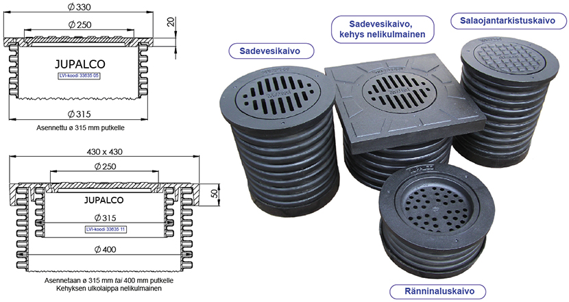 Jupalcon pyöreä valurautainen kansisto sopii ulkohalkaisijaltaan ø 315 mm:n muoviputken sekä ø 300 mm:n betoniputken päälle. Näitä ratkaisuja käytetään rakennettaessa mm. sadevesikaivoja syöksytorvien alle, pihojen sadevesiviemäröinnissä sekä salaojien tarkastuskaivoina. Kolmesta erikansivaihtoehdosta löytyy tarkoitukseen sopiva ratkaisu kaikkiin tarpeisiin.